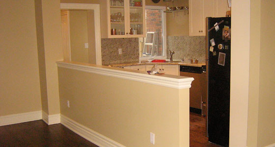 AFTER This is the opposite view of the new kitchen we installed, showing the half wall to give this area a more open feel to it.